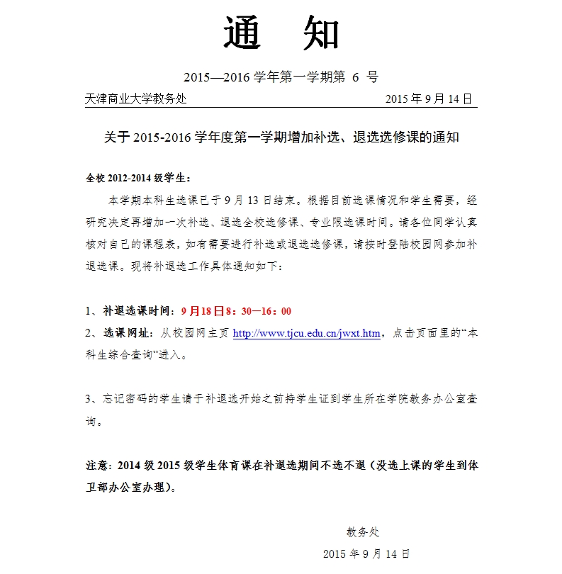 关于2015-2016学年度第一学期增加补选、退选选修课的通知