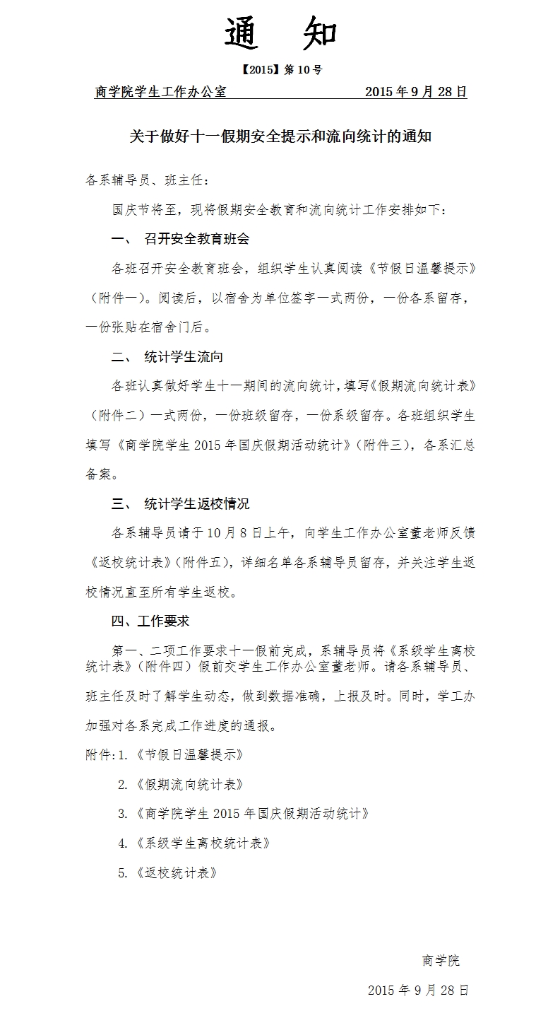 附件一《节假日温馨提示》附件二 《假期流向统计表》附件三《商公司员工2014年十一假期活动统计》附件四《系级员工离校统计表》附件五《返校统计表》