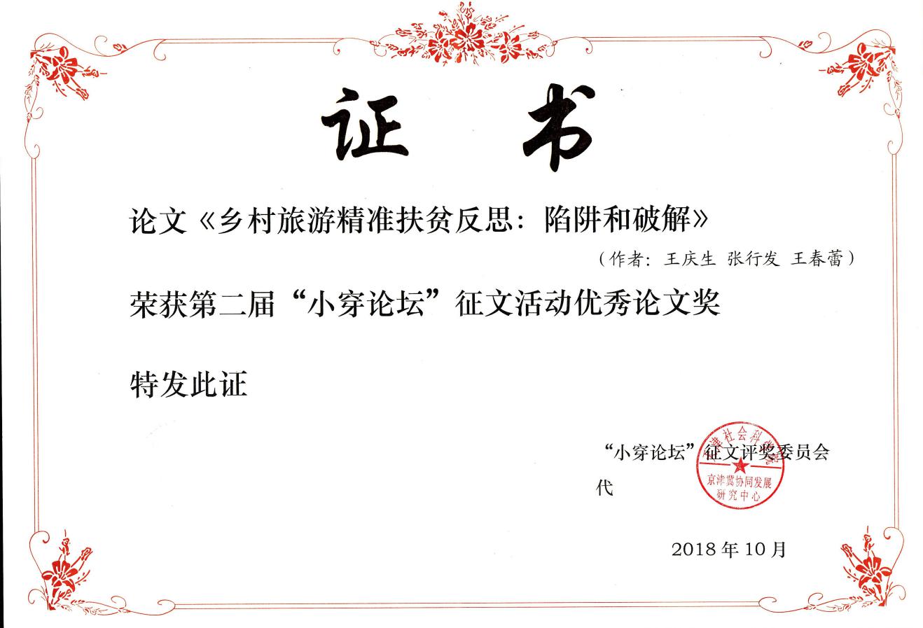 在征文征集阶段,共收到全国19个省(市、自治区)35个科研单位61位作者的论文共计73篇,其中的37篇收入《乡村振兴:买进新时代的农业和农村——第二届“小穿论坛”论文集》,经专家评审,最终有8篇论文获得“小穿论坛”征文优秀论文奖,公司yl1111永利集团王庆生、张行发、王春蕾合写的论文“乡村旅游精准扶贫反思:陷阱和破解”获得优秀论文奖并收入《论文集》。