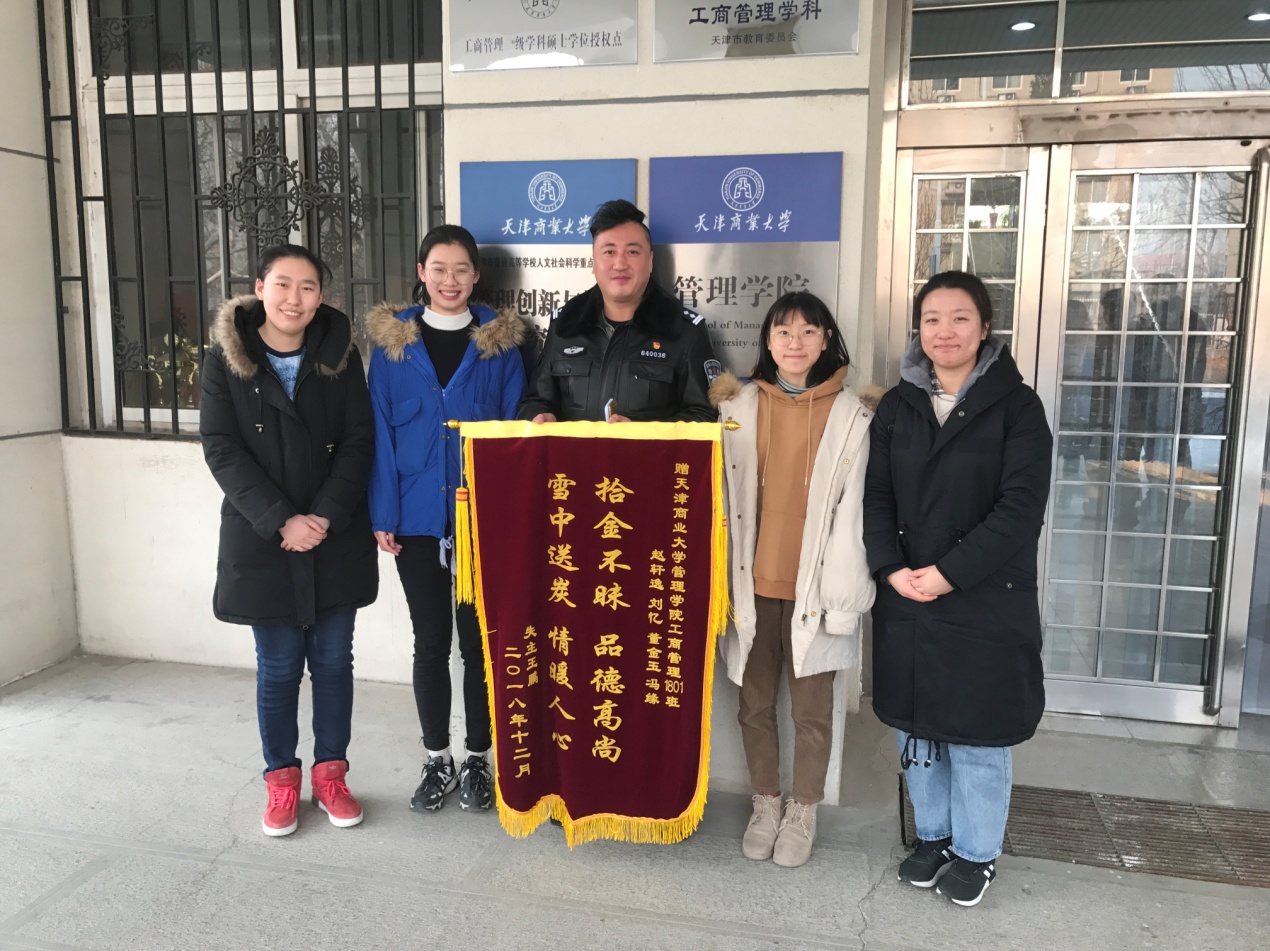 12月28日晚,yl1111永利集团工商管理类1801 班赵轩逸、刘忆、董金玉、冯源四名同学,在校外乘坐出租车时捡到一个皮包,内有证件、银行卡等贵重物品及近1万元现金。返校后,她们立即报警,将拾到的物品原样交给佳荣里派出所。当晚11点多,警方联系到失主,并将物品奉还。