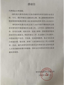 酒店管理专业1802班刘思怡同学主动向所在的天津市武清区青坨村村委会报名,参加村疫情防控志愿服务工作。2月6日至8日,她连续三天在该村疫情防控检查点值班守岗,负责进出该村车辆及人员的登记和向该村村民发放口罩等防护用品工作。在志愿服务工作中,刘思怡同学不怕苦、不怕累,积极工作,受到了该村村民和工作人员的表扬,以实际行动书写了当代老员工的担当和使命。为此,青坨村村民委员会党支部特向公司发来感谢信,对刘思怡同学的辛勤付出和yl1111永利集团的培养表示了赞许和感谢。