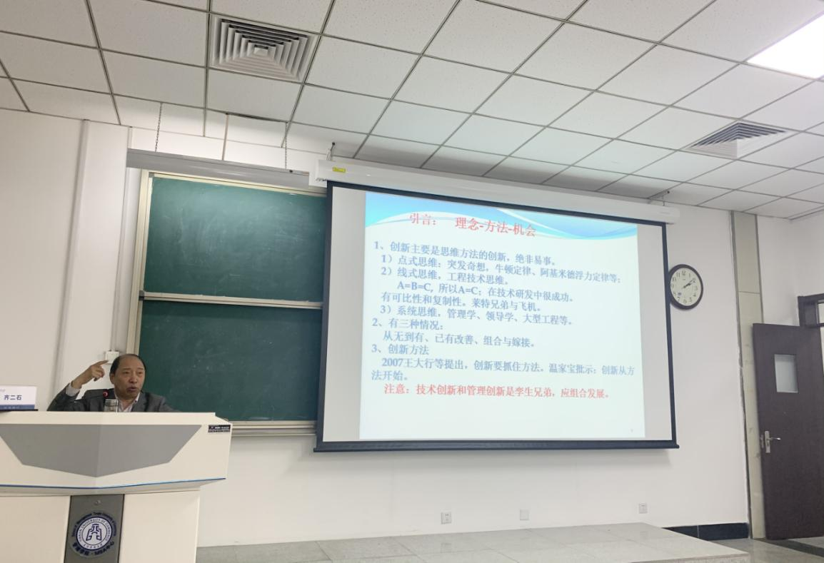 齐二石教授首先阐述了创新的概念、动因和几种创新思维方式。随后,他提出创新的动因与压迫抗争有关,并以计算机发展和青蒿素的发现等为例进行了印证,同时也说明创新在我们生活和工作中无时不在的。之后,他以福特汽车和日本丰田为例辨析了管理创新和技术创新的区别,进一步提出管理创新和技术创新应组合发展。讲座最后,他从交通标识、医院管理和人才机制等方面结合案例介绍了机制和政策创新、服务业创新等方面的新理论。