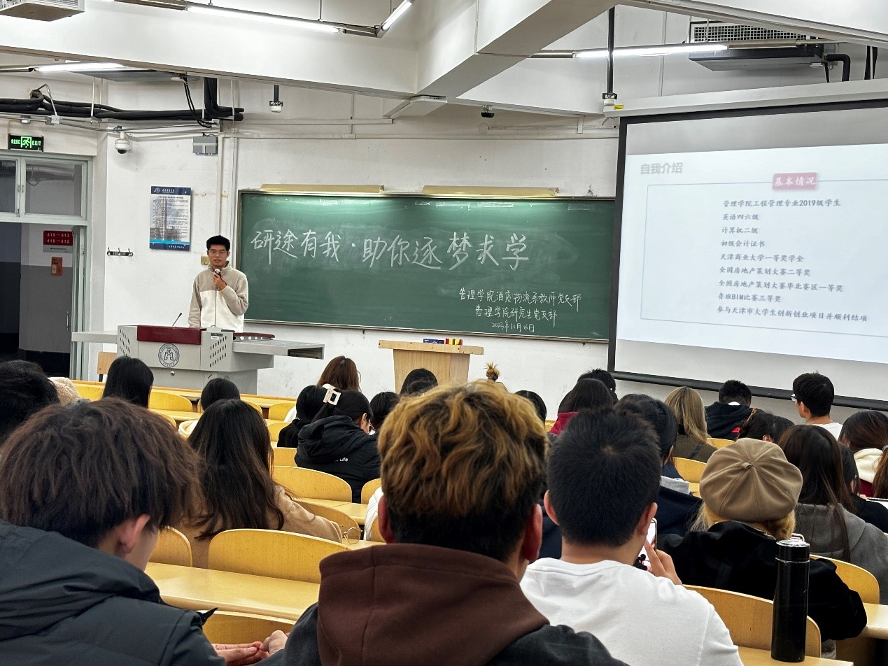 酒店管理系教师邢博以“明确规划的重要性”为导向,“脚踏实地的必要性”为准则,向各位同学传递了“路不能盲目走,研必须坚定考”的理念。物流管理系教师李辉用幽默风趣的语言引导员工从实际出发,明确未来发展方向,并分享科学备考方法。